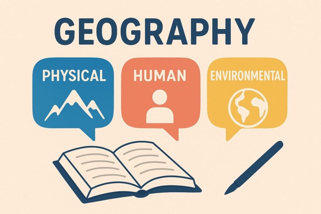 Geography blends physical science with social science. Students cover ecosystems, natural disasters, demographics, economics, and sustainability.